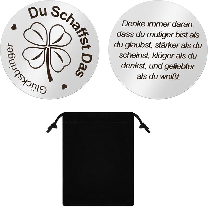 Wszechstronny zestaw: Ten zestaw zawiera srebrną, okrągłą monetę z inspirującymi tekstami i wzorami po obu stronach. Dzięki średnicy 30 mm i wadze zaledwie 7,5 g z łatwością zmieści się w kieszeni kurtki lub portfelu i można ją zabrać wszędzie. Ten amulet z koniczyną zawsze przyniesie Ci szczęście.