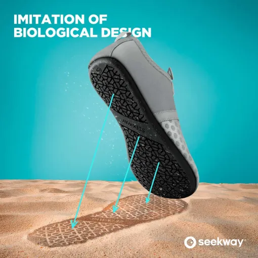 • Ochrona amfibii: Ten but został zaprojektowany zarówno do użytku w wodzie, jak i na lądzie. Gumowa podeszwa zewnętrzna chroni stopy przed ostrymi przedmiotami, takimi jak kamienie, żwir, muszle, a także przed poparzeniem gorącym piaskiem lub kładką. Antypoślizgowy pasek na podeszwie zapewnia doskonałą przyczepność nawet na śliskich nawierzchniach.