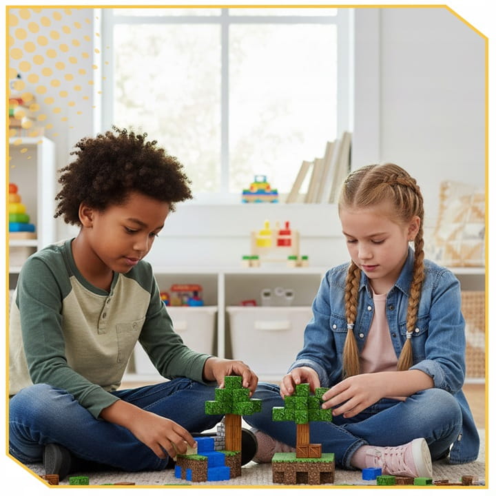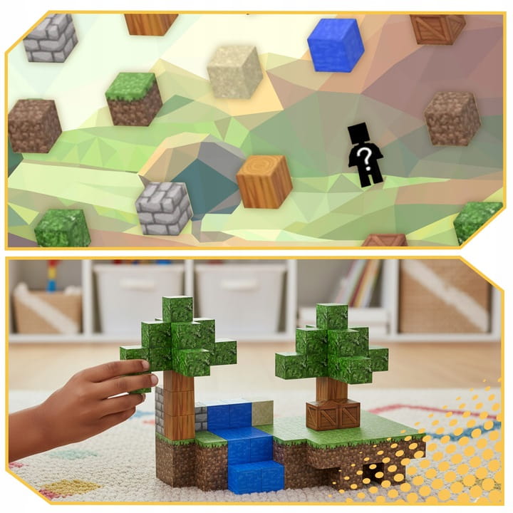 ⮕ Zestaw zawiera różne klocki, które pozwalają na zbudowanie naturalnego środowiska (m.in. bloki trawy, drewna, liści) oraz różne akcesoria (tj. piec, stół warsztatowy, książki).