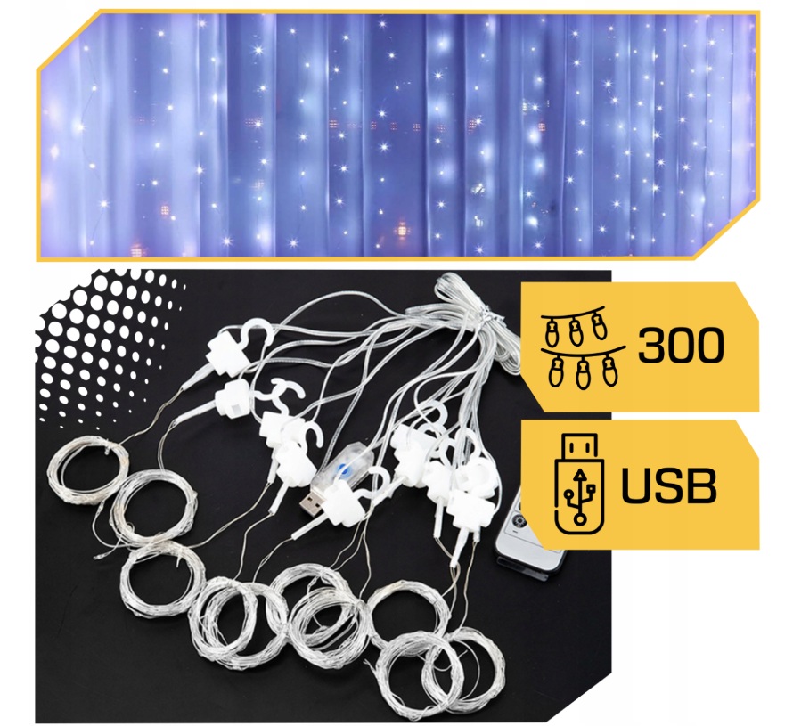 KURTYNA LED 300 LAMPEK 3x3m – ŚWIĄTECZNA DEKORACJA Ciepłe ŚWIATŁO | Z PILOTEM