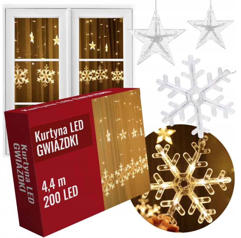 ŚWIĄTECZNA KURTYNA ŚWIETLNA LED Z GWIAZDKAMI | 200 DIOD | CIEPŁE BIAŁE ŚWIATŁO