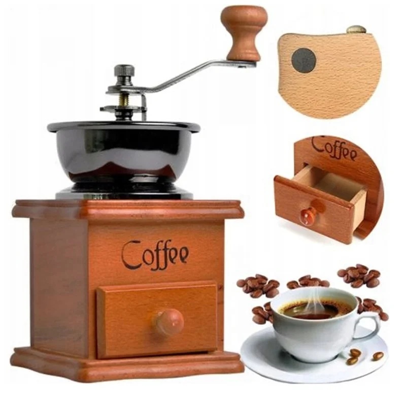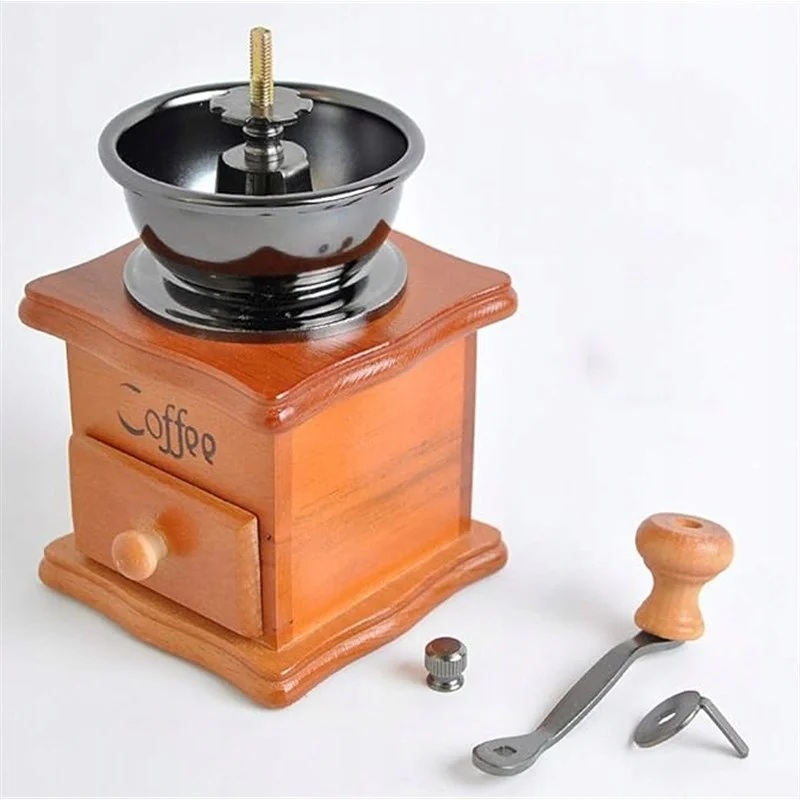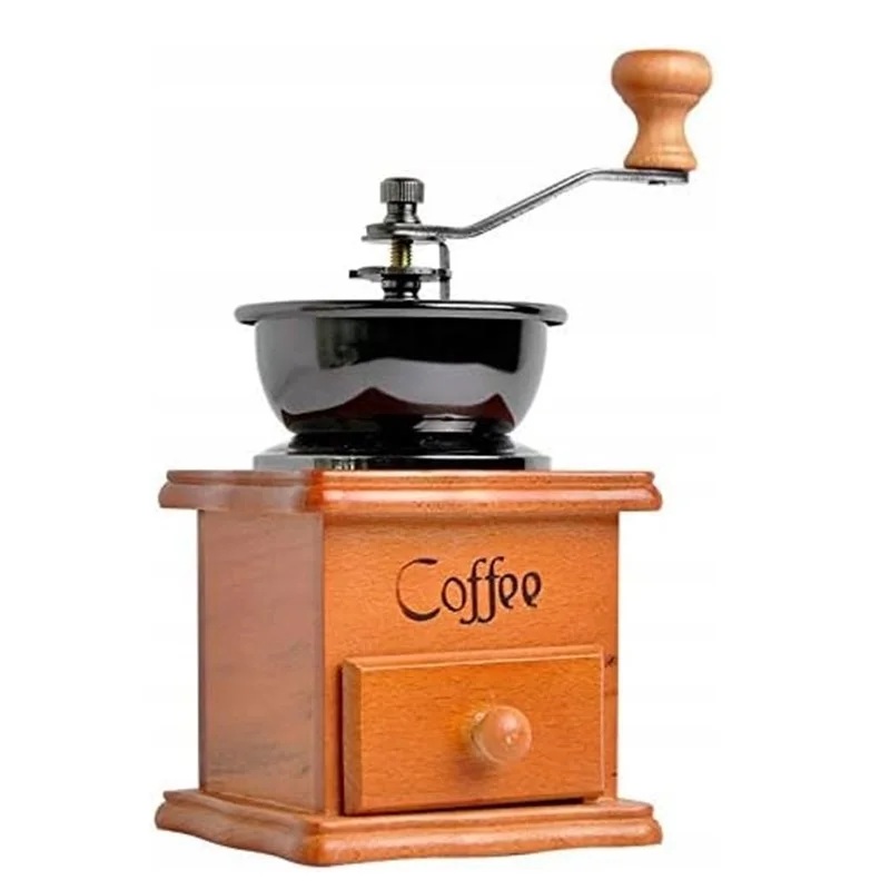 Ręczny młynek do kawy wykonany z wysokiej jakości drewna sosnowego, z ceramicznym trzonem i żeliwnym mechanizmem mielącym.
