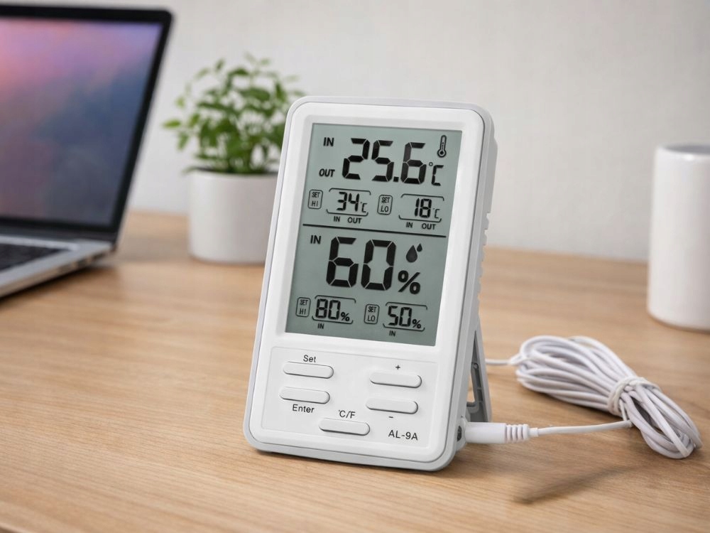 Wbudowany higrometr pozwala monitorować poziom wilgotności w pomieszczeniu. Dzięki temu łatwo utrzymasz odpowiednie warunki dla roślin, zwierząt, przechowywanych produktów lub komfortu domowników.