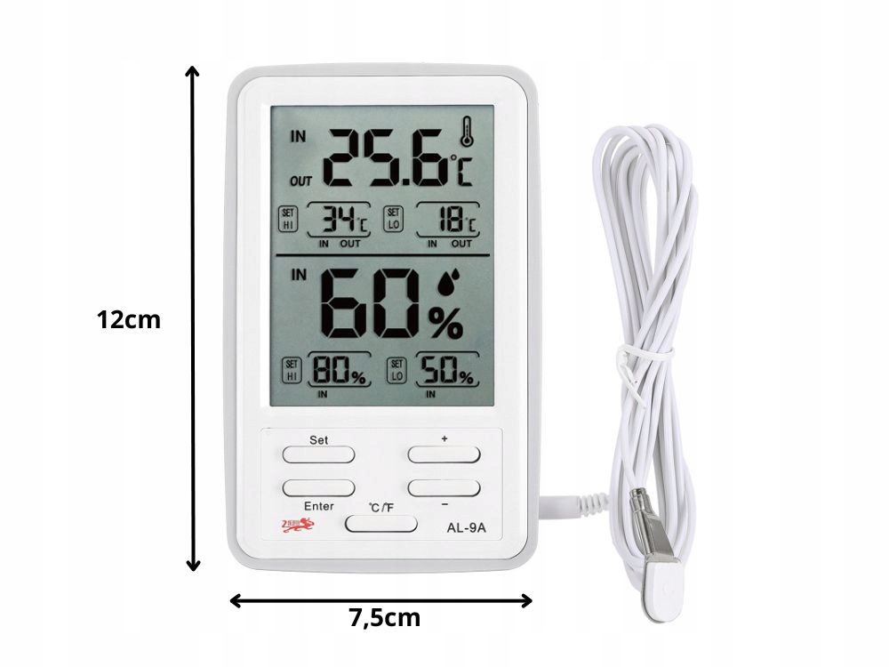 Urządzenie umożliwia jednoczesny pomiar temperatury w pomieszczeniu oraz na zewnątrz dzięki przewodowemu czujnikowi. To idealne rozwiązanie do kontroli temperatury w domu, szklarni, terrarium, magazynie lub piwnicy.