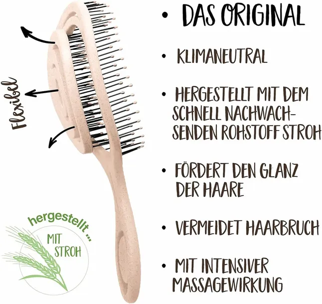 Szczotka wykonana jest z przyjaznego dla środowiska bioplastiku, wegańska i neutralna klimatycznie. Dzięki elastycznej główce nie tylko ułatwia rozczesywanie, ale także zapewnia delikatny masaż skóry głowy.