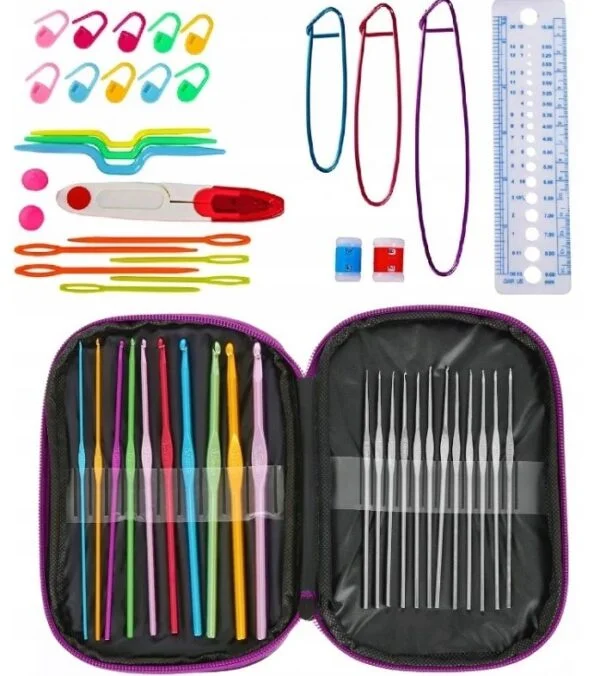 Zestaw idealny dla początkujących i zaawansowanych, zawiera wszystko, co potrzebne do szydełkowania: 10 szydełek w różnych rozmiarach, nożyczki, linijkę, igły, liczniki, przytrzymywacze do szwów oraz agrafki. Wszystko w praktycznym etui z ekoskóry.