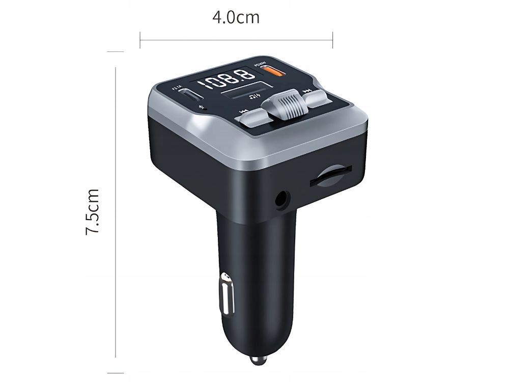 Transmiter FM umożliwia bezprzewodowe przesyłanie muzyki z telefonu przez Bluetooth bez potrzeby wymiany radia. Wystarczy podłączyć urządzenie do gniazda zapalniczki i ustawić tę samą częstotliwość FM w transmiterze i radiu. Urządzenie obsługuje też odtwarzanie plików MP3 z karty pamięci TF oraz pendrive’a.